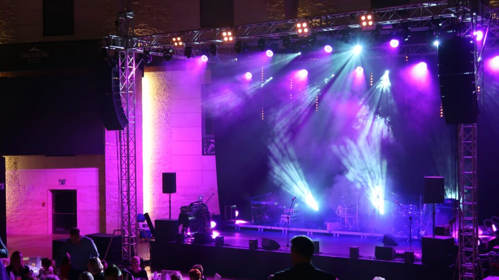Scena to nie tylko podest. Dobra konstrukcja to cały kompleksowy system dźwiękowy i wizualny. Oferujemy pełne nagłośnienie, dostosowane do akustyki miejsca oraz wymagań występujących artystów. Pracujemy na sprzęcie renomowanych marek, takich jak QSC, Dynacord, Shure i Pioneer, co gwarantuje najlepszy jakościowo dźwięk, bez zakłóceń i przesterów. Dodatkowo, zapewniamy nowoczesne systemy oświetleniowe – reflektory LED, ruchome głowy i listwy RGB. Dzięki sterowaniu DMX mamy pełną kontrolę nad światłem w czasie rzeczywistym, tworząc oprawę idealną.